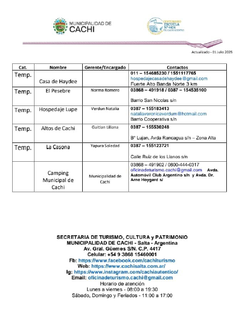 Fuente: Secretaría de Turismo de Cachi (actualización 01/07/2025).